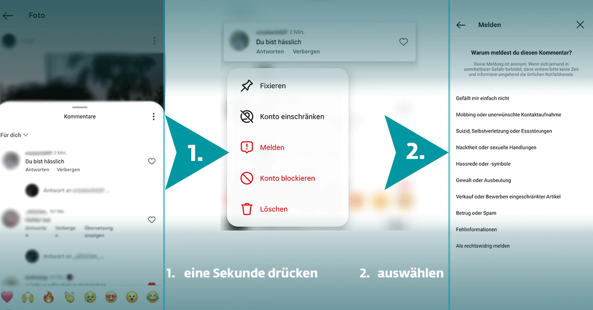 Zeigt Eurem Kind, wie es Blockier- und Meldefunktionen nutzt, um unangenehme unerwünschte Kontakte oder Inhalte zu stoppen. Besonders wichtig ist das gerade bei Fällen von Cybermobbing, aber auch bei sexueller Belästigung und Cyber-Grooming. Diese Gefahren können eintreten, wenn ein Chat-Partner beginnt, Eurem Kind sexuelle Nachrichten oder Bilder zu schicken – oder es dazu bringen möchte, solche zu versenden.